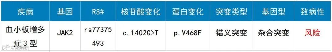 检测结果让她大为震惊:报告显示J女士存在JAK2基因c.1402G>T疑似致病杂合错义突变,提示J女士可能患“血小板增多症3型”。这与J女士两年前做骨髓穿刺得到的基因检测报告结果完全吻合,甚至连症状特征和治疗建议都分毫不差。