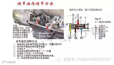 722.3型自动变速器采用节流式双级 调速器,它安装在自动变速器的输出轴部位,内部有两个质量不同的重块,在离心力的作用下,重块带动滑阀打开相关的油道,改变通油截面面积,这样就能够使调速器油压与车速相匹配,调速器油压调整螺钉及测试孔件下图: