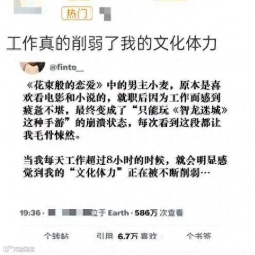 累到文化体力不支这一微博热搜词条,起源是一位网友的感慨,指难以去思考一些文化活动,更多的倾向于“快速的”“碎片化的”活动。