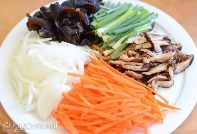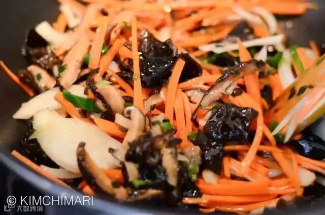 材料:粉丝、洋葱、干木耳、植物油、胡萝卜、蘑菇、酱油、米酒、大蒜、糖、芝麻油、胡椒粉