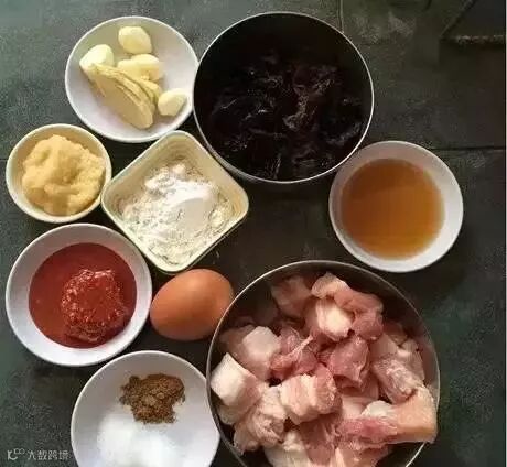 材料:肉片、鸡蛋、干木耳、黄瓜、洋葱、食物油、辣椒油、蒜、姜、盐、豆瓣酱、淀粉