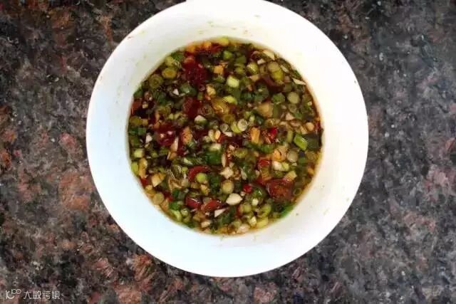 调制酱汁,在一个小碗中一起搅拌醋、油、酱油、芝麻油知道融合在一起,然后加入香菜、大蒜、葱等。