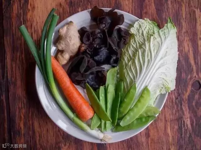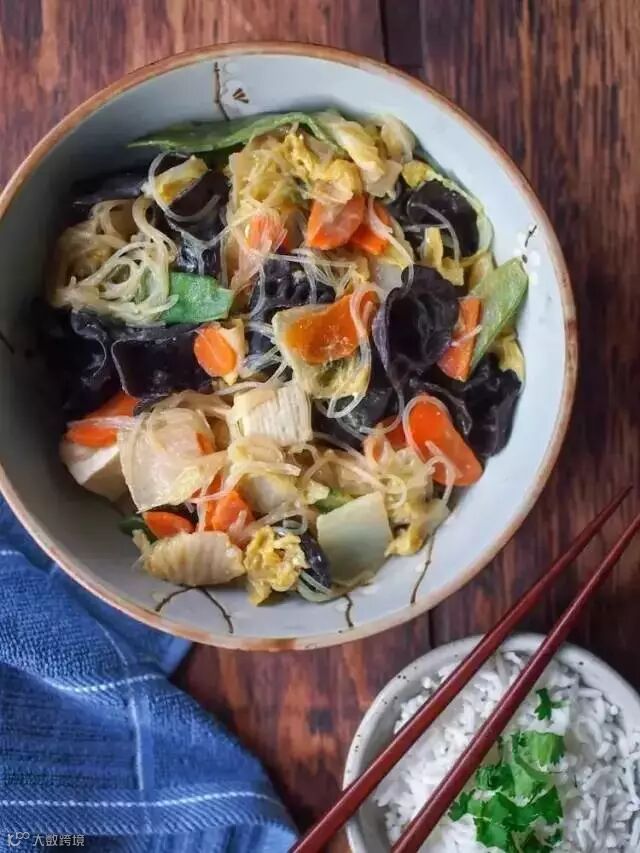 材料:黑木耳、粉丝、植物油姜,去皮切片、洋葱,切碎、胡萝卜,白菜、酱油,芝麻油、豌豆、豆腐、盐