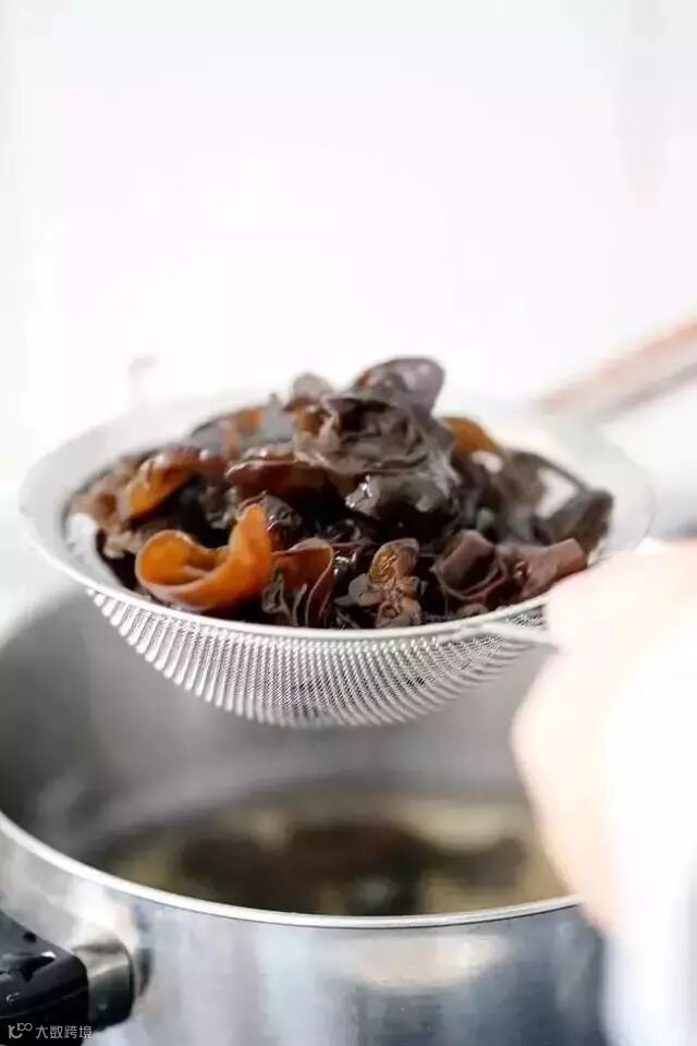 将干黑木耳在热水中浸泡约1小时或直到软化。在流水下清洗,并取出木耳梗。如果有必要撕或切成小块。
