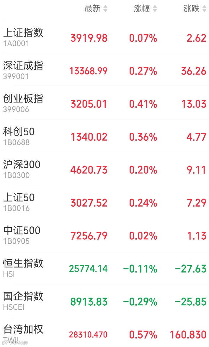 1、A股:A股窄幅整理,上证指数收盘涨0.07%报3919.98点,深证成指涨0.27%,创业板指涨0.41%,市场成交额1.92万亿元。锂电池、光刻机产业链走强,能源金属概念股同步上涨,商业航天题材深度回调,旅游股全线下挫。三只新股上市,纳百川涨逾400%,锡华科技涨超260%,天溯计量涨逾170%。
