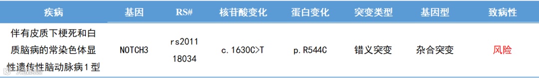 报告结果显示:他的NOTCH3基因存在c.1630C>T致病性杂合错义突变(如上图),提示L先生可能患“伴有皮质下梗死和白质脑病的常染色体显性遗传性脑动脉1型(CADASIL)”,该致病突变有50%的概率会遗传给他的下一代,由于该疾病的遗传方式呈常染色显性遗传,可能致其患病。