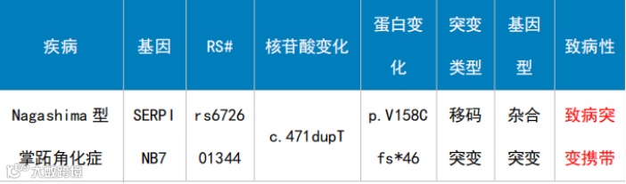 一月前L女士(化名)接受医学级人体全套基因体检服务,基因体检报告显示:SERPINB7基因c.471dupT位点杂合移码突变,提示她携带“Nagashima型掌跖角化症(NPPK)”的致病基因,自身一般不会患病,但是会有50%的概率将致病基因遗传给下一代。Nagashima型掌跖角化症的主要临床特征为掌跖部位呈现境界清楚的弥漫性红斑及非残毁性角化过度,皮损可越界至手足背侧、手腕内侧、踝及跟腱部位,也可累及肘膝,并且在遇水后会出现肿胀发白的情况。