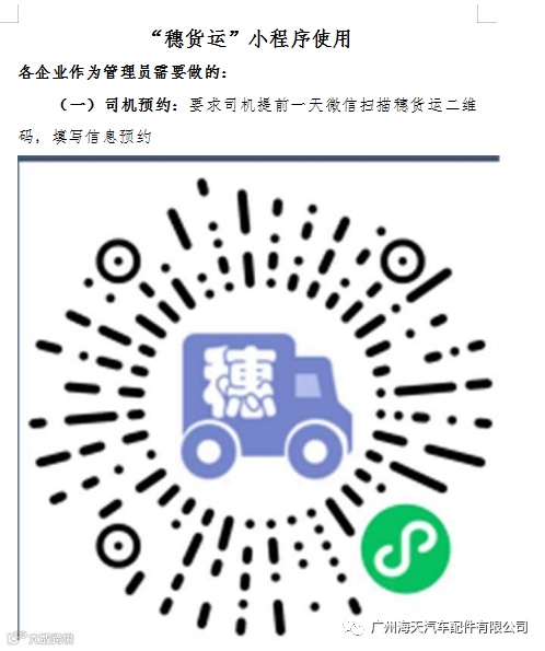 5、货车进出除了登记扫码,另需在保安室扫“穗货运”,各部门请提前将公司穗货运转给物流公司提前登记报备(各部门可查找邮件或到人力资源部拿取)。