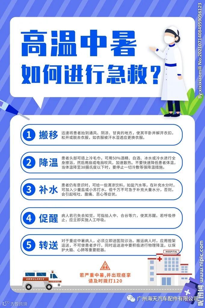 2、轻度中暑:除头晕、口渴,还常伴有面色潮红、胸闷烦躁、大量出汗、皮肤灼热等表现,或者出现恶心、呕吐、四肢湿冷、面色苍白、血压下降、脉搏增快等表现。这时患者体温往往在38.4℃以上,如果及时处理,往往可在数小时内可以恢复;