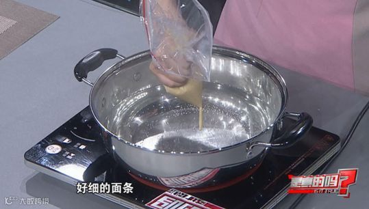 把锅中的水烧开后转成小火,将面粉液均匀挤到锅里。一袋面糊糊就在锅中变成了长长的面条,挤完以后将火转成大火继续煮,再用漏勺将面条捞出。