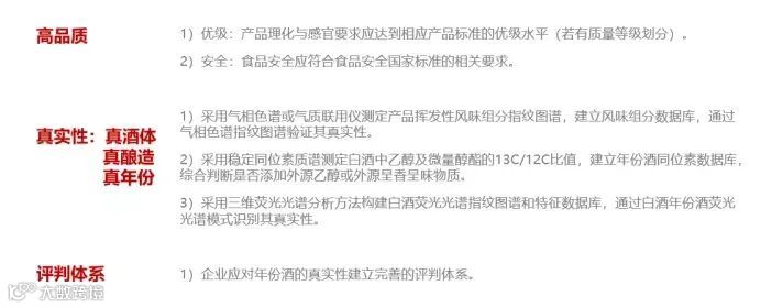 中国酒业协会正在构建的中国白酒新的品质与价值表达体系为老酒表达制定了标准,那就是中国白酒年份酒标准。中国白酒年份酒标准有严格的准入条件、申请认定、监督管理与产品标准。白酒年份酒标准以年份表达老酒之老、老酒之品,就是老酒的规范表达、标准表达。