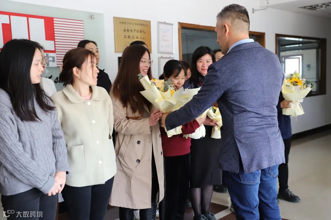 3月8日当天10点半,生产和办公室的女性员工都从繁忙工作中抽出一些时间,分别集中领取花束和购物卡。