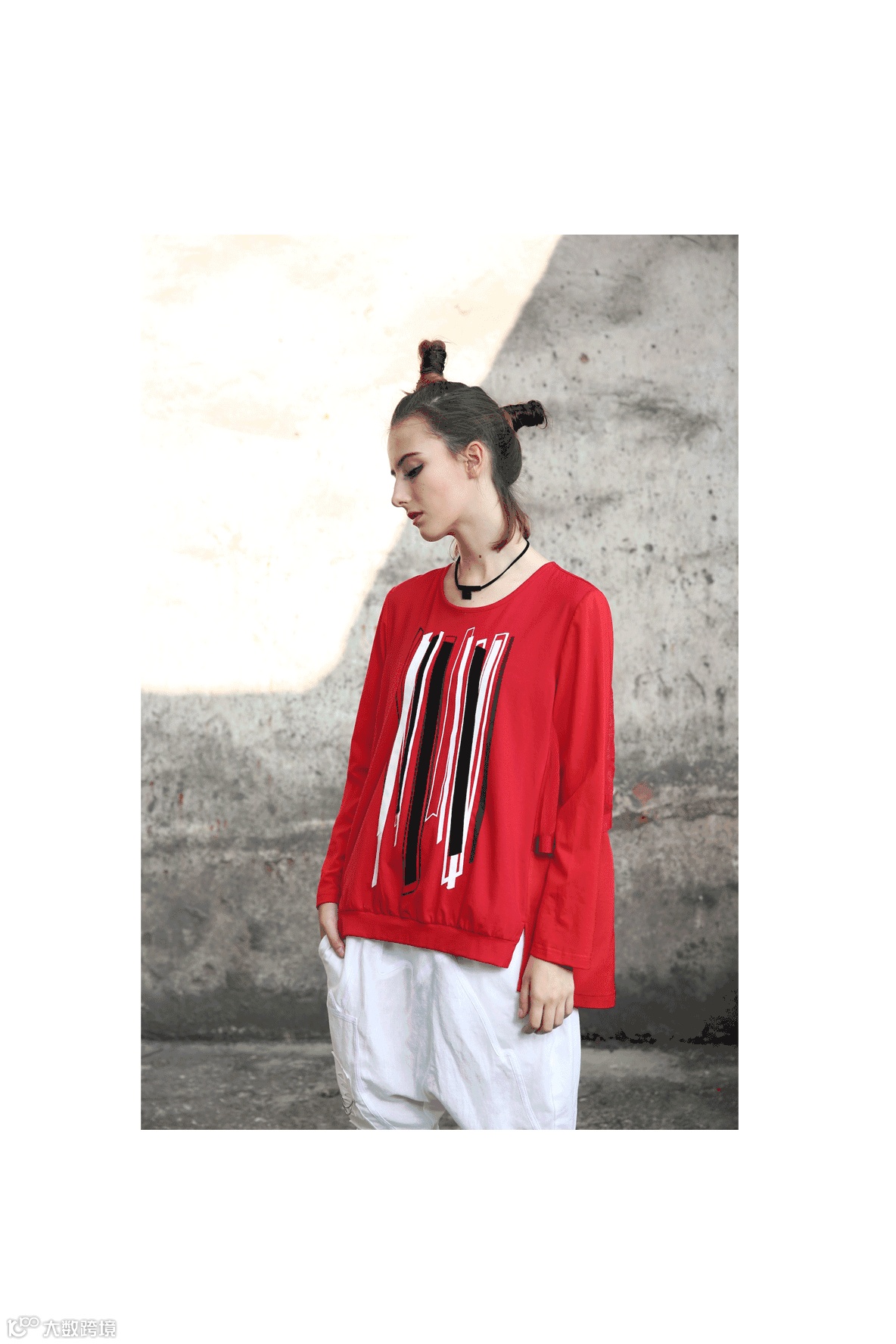 黑白分明的织条在跳跃着,不束形于条框,拥有自己的形态,极尽延展自我个性,开叉的下摆,让人觉得不束于行,更加简单随性。