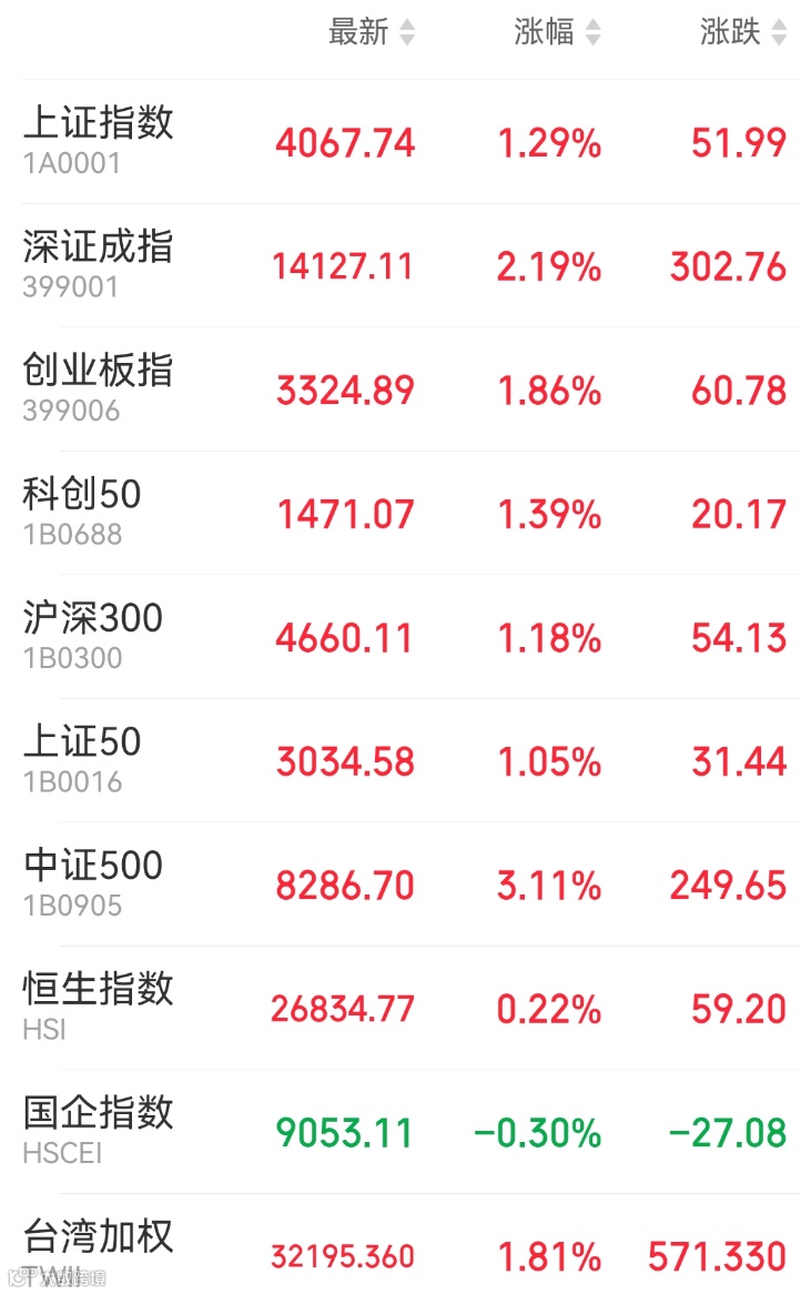 1、A股:周二A股震荡走高,上证指数收涨1.29%报4067.74点,深证成指涨2.19%,创业板指涨1.86%,万得全A涨2.12%,市场成交额降至2.57万亿元,上日为2.61万亿元。太空光伏、商业航天概念股集体爆发,算力硬件、AI应用端、京津冀概念股表现强势。