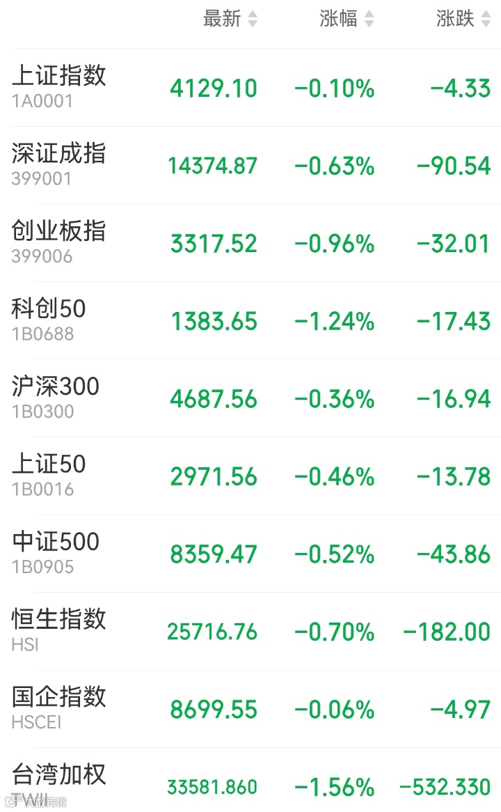 1、A股:A股震荡走低,上证指数跌0.1%报4129.1点,深证成指跌0.63%,创业板指跌0.96%,万得全A跌0.53%,市场成交额2.46万亿元。风电、储能、化工、煤炭股涨幅居前;军工、贵金属、半导体跌幅靠前,太空光伏、算力硬件、人形机器人、AI应用题材走弱。