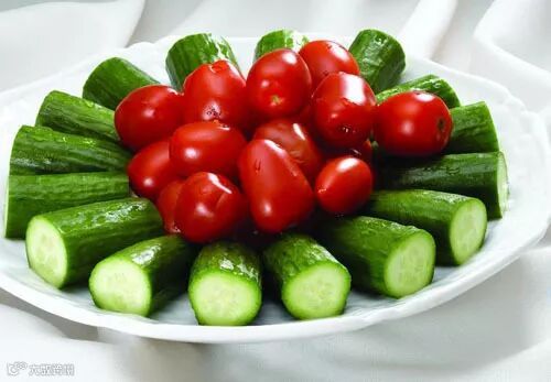 用西红柿、黄瓜做一盘“解酒菜”,喝酒的时候多吃点。