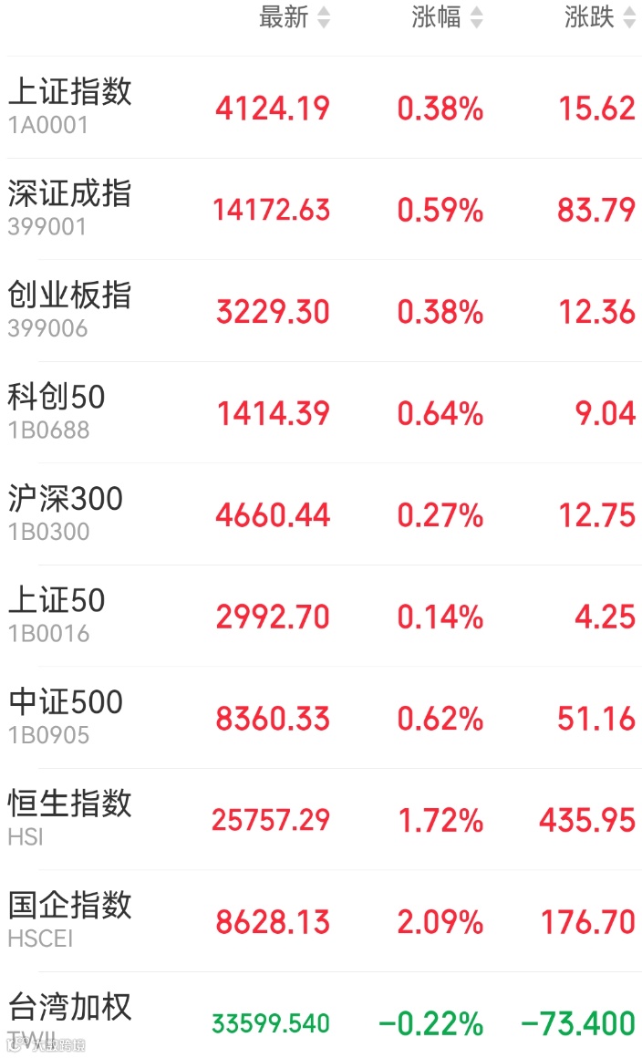 1、A股:A股三大指数震荡走高,上证指数收涨0.38%报4124.19点,深证成指涨0.59%,创业板指涨0.38%,万得全A涨0.71%。市场全天成交2.22万亿元,上日成交2.41万亿元,场内逾4200股上涨。美国缺电逻辑持续带动电网设备板块大涨;政府工作报告提出推动创新药和医疗器械高质量发展,医疗、创新药板块集体走强。农业种植概念股表现抢眼,化工股震荡反弹,电池产业链表现活跃,算电协同概念走强。油气股延续跌势,海运、煤炭表现不振,CPO概念集体下跌。上周,上证指数累计下跌0.93%,深证成指跌2.22%,创业板指跌2.45%。