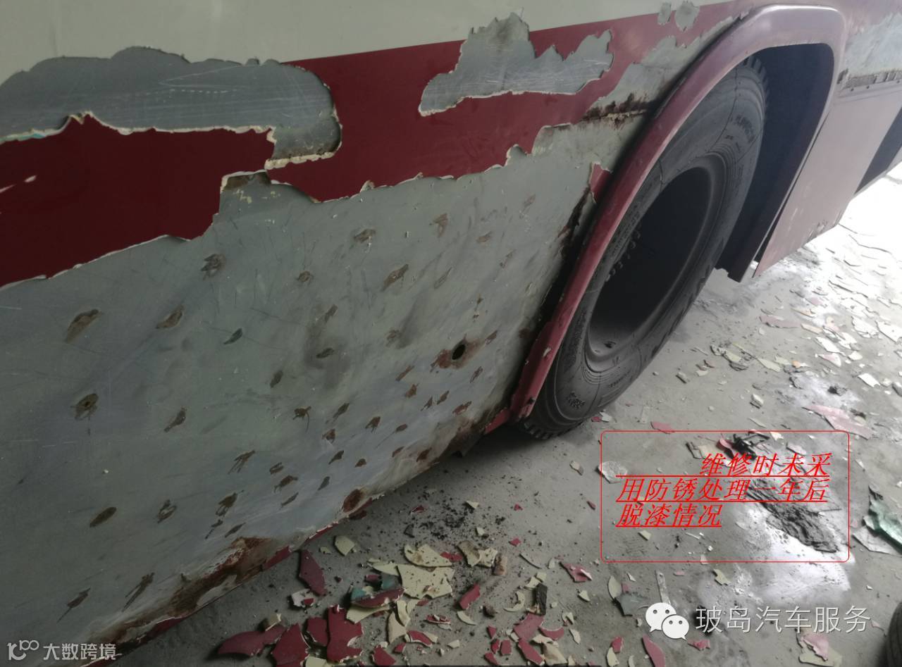很多汽修厂至今仍然没有防锈处理的概念,即使有,但为了节约成本或时间,往往省略环氧底漆防锈处理工序,在裸铁表面直接刮灰,喷漆后表面看似焕然一新,并且交车时间比做防锈处理可以提前一天,特别是没有生锈概念的大巴车主却浑然不知,不出一年油漆脱落、鼓包、沙板锈蚀,时间再长点锈烂穿洞,到头来只能整件更换,对新车客户还说可谓冤到家了,花了钱、花了时间却修坏了新车!