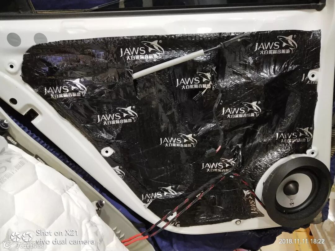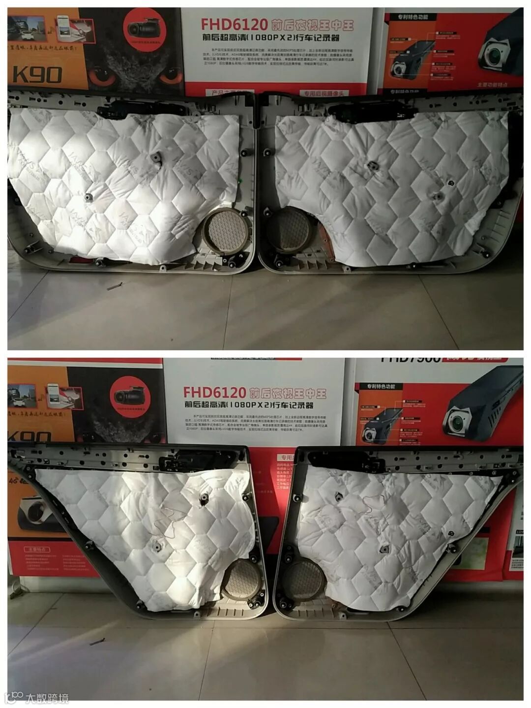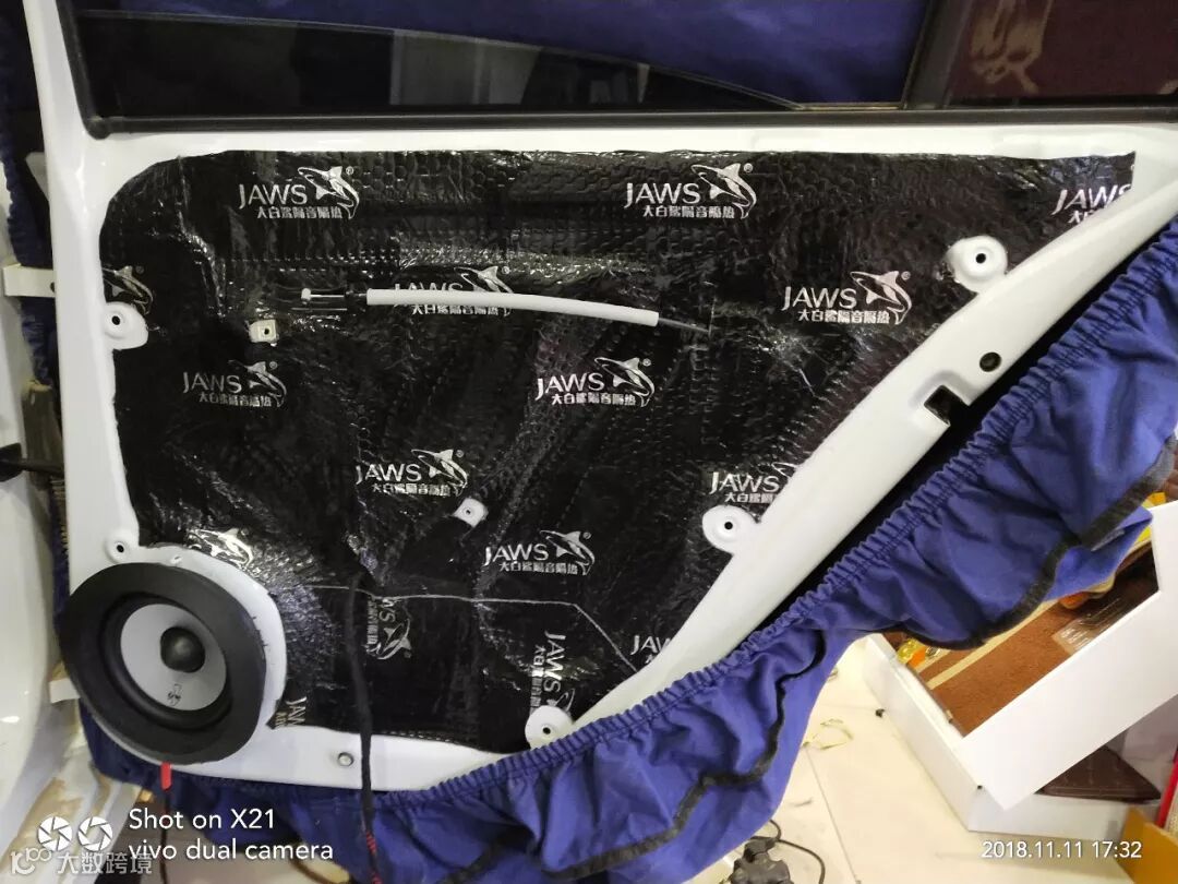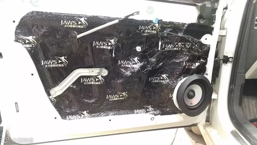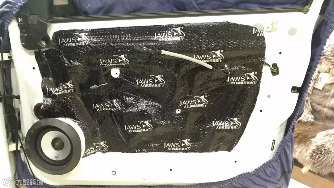 为了给声场喇叭创造一个良好的工作环境,改装技师使用大白鲨隔音材料,对汽车的门板做了双层隔音处理,以降低风噪、共振等噪声对音响品质的干扰,让音响品质更为干净。