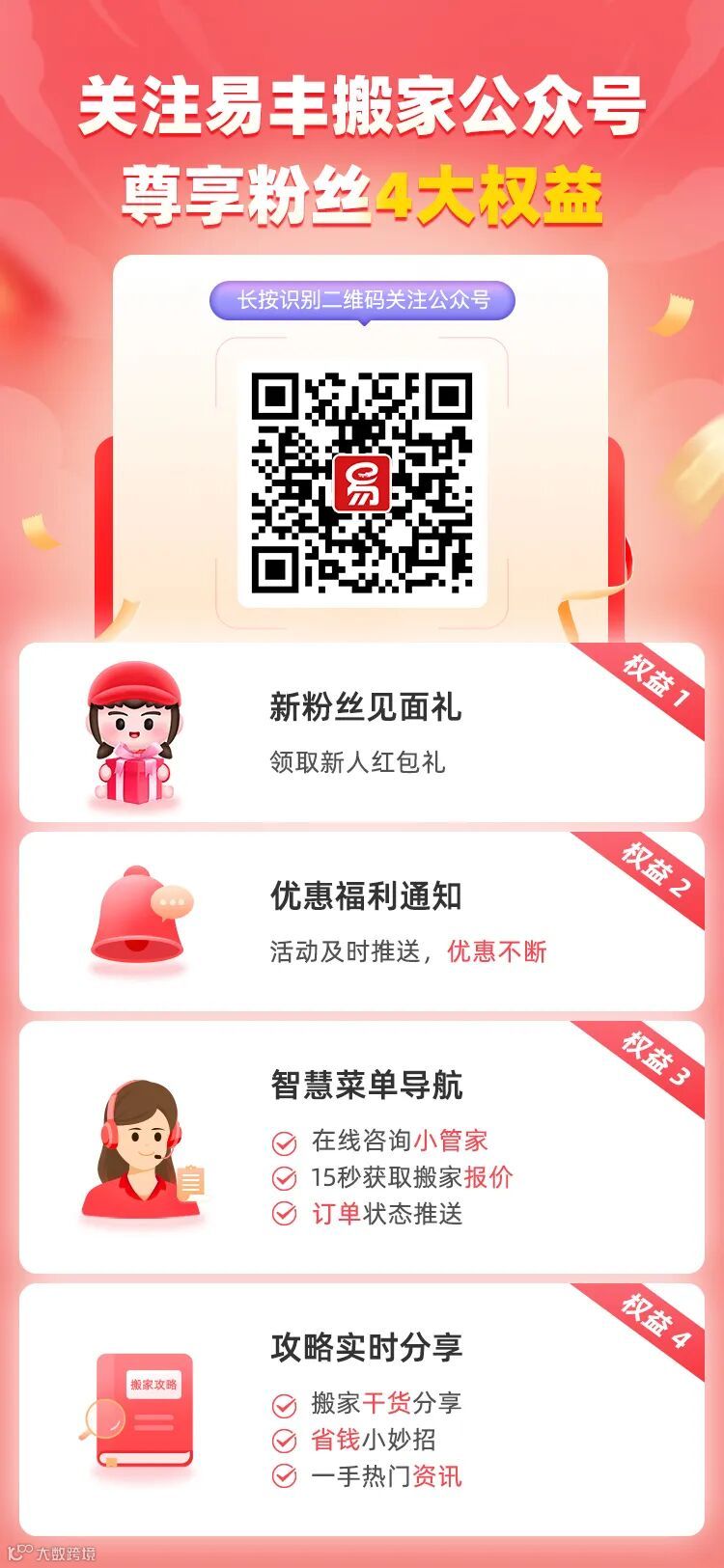关注易丰搬家公众号,领取大额新人红包礼🧧🧧🧧