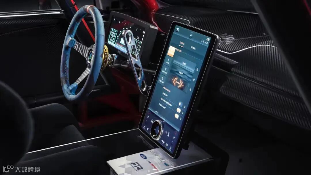Mustang Mach-E1400在车身覆盖件的选材之上别出心裁,前舱盖采用了独特的亚麻复合材料,这是一种新型的可再生有机复合纤维,车身覆盖件均采用碳纤维,配上中国版的限定配色和外观套件,整体造型犀利而张扬。