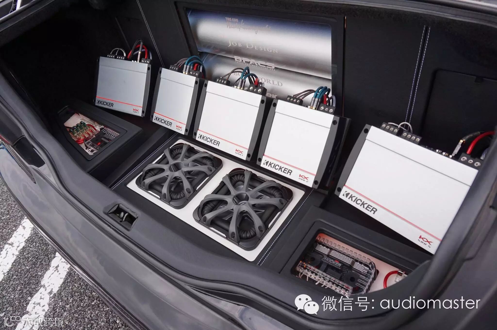 后备箱的安装效果,五台美国K牌KX系列功放,两只8寸K牌L7发烧级低音