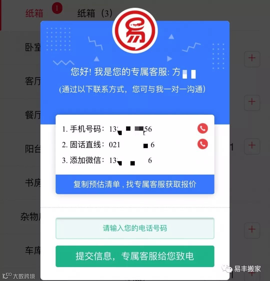 测量完搬家物品体积之后,复制清单,通过这些方式联系我们,获取搬家报价: