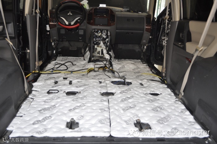 汽车音响效果的表现赖于主机、功放、高中低音喇叭、电容、线材的通力配合才能达到最佳。对于入门级的改装配上双门隔音是必须的工程之一,这样才能体现出音响的效果,而且慢慢的您会发现音质效果会越来越好,那么小编就带您看看这款三菱帕杰罗的完美变身吧!