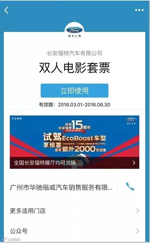 卡券持有人莅临广州华驰福特试驾任意车型,即可凭券兑换电影票电子码。电子码可在时光网使用,有效期至2016年12月31日。