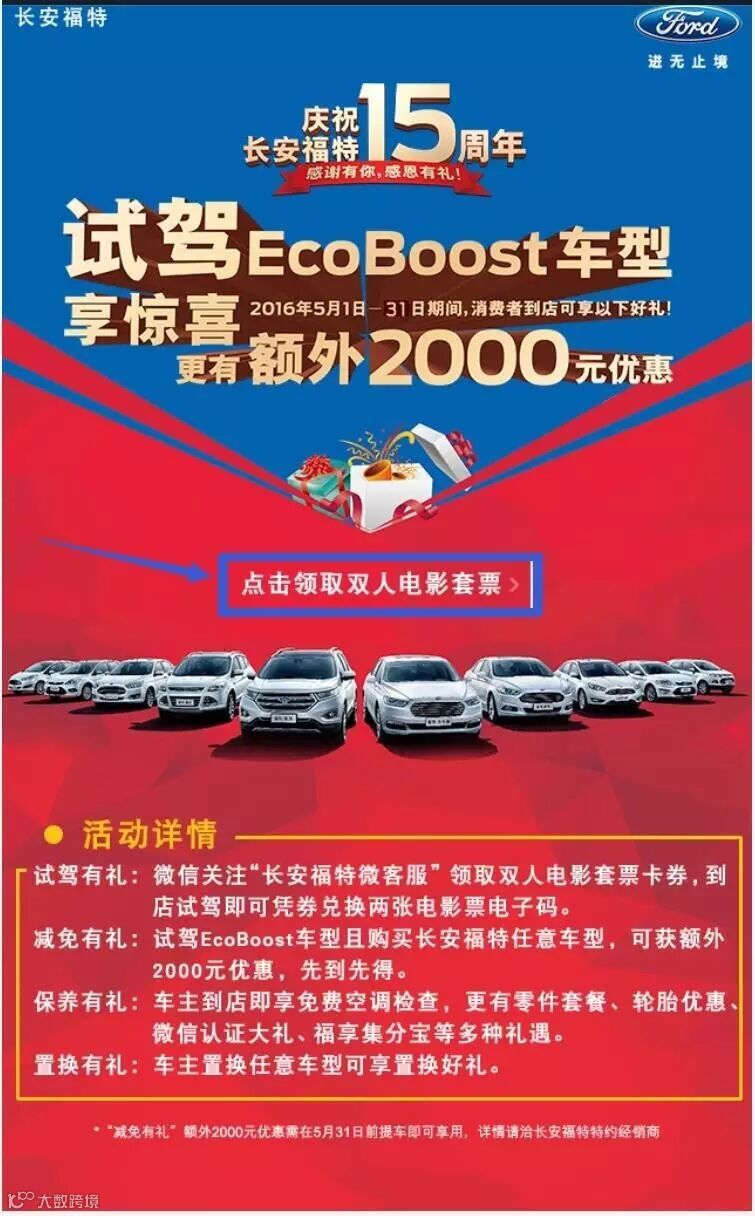 5月14日至5月31日,通过活动微信报或扫描二维码关注长安福特微客服即可领取“双人电影票套票”卡券,每个微信ID限领一次;