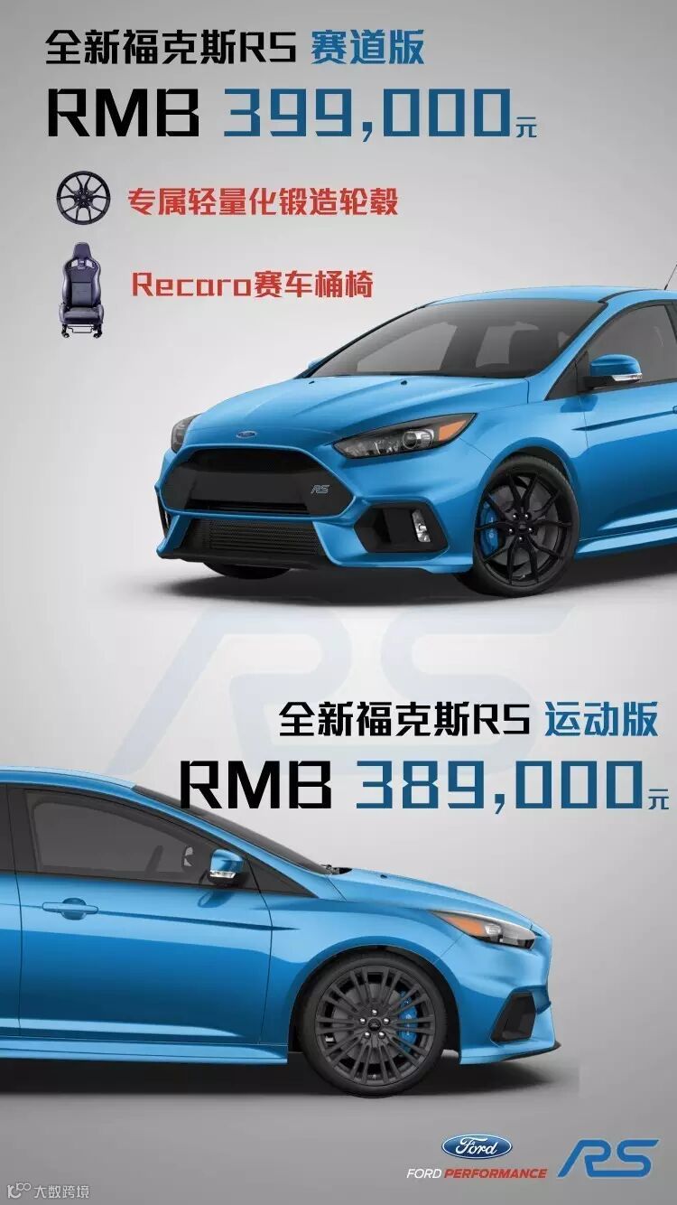 针对中国性能车发烧友福特共推出两款全新福克斯RS车型:全新福克斯RS运动版,厂商建议零售价为389,000元;全新福克斯RS赛道版,厂商建议零售价为399,000元。即日起,消费者可前往福特中国142家指定授权进口车经销商处进行选购预定。