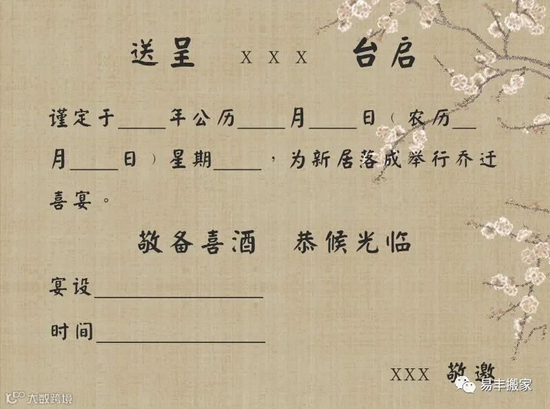 选好吉日吉时后,就可以编辑好乔迁宴的短信或买好邀请函,提前10天左右,邀请亲朋好友来参加乔迁宴。