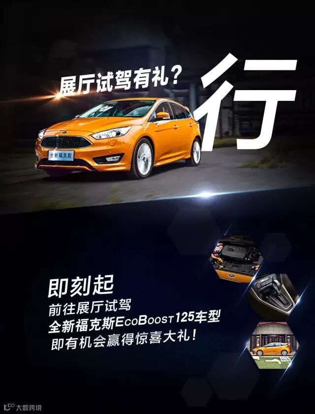 即刻起,可报名前往广州华驰福特展厅试驾全新福克斯EcoBoost125车型,感受1.0L EcoBoost 汽油直喷涡轮增压发动机带来的推背感,不仅如此,还有精彩纷呈的奖品可以拿!