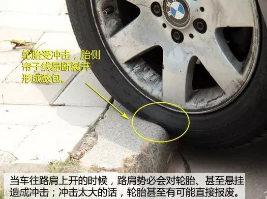 原因很简单,在车辆骑上路肩的过程中,轮胎会受到挤压,容易导致轮胎侧面的帘子线断裂,久而久之就会造成轮胎鼓包。所以,别说停车停在路肩上,就算是平时开车,都要尽量避开坑洞、凸起这些地方。坑洞、凸起越大,车速越快,轮胎受到的挤压力就越大,受到的伤害就越大。