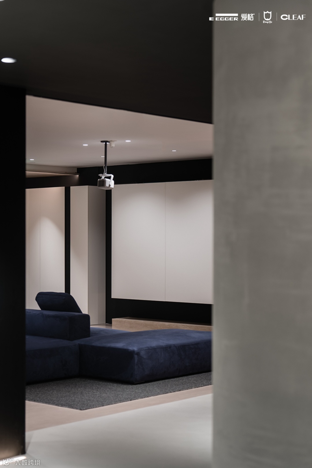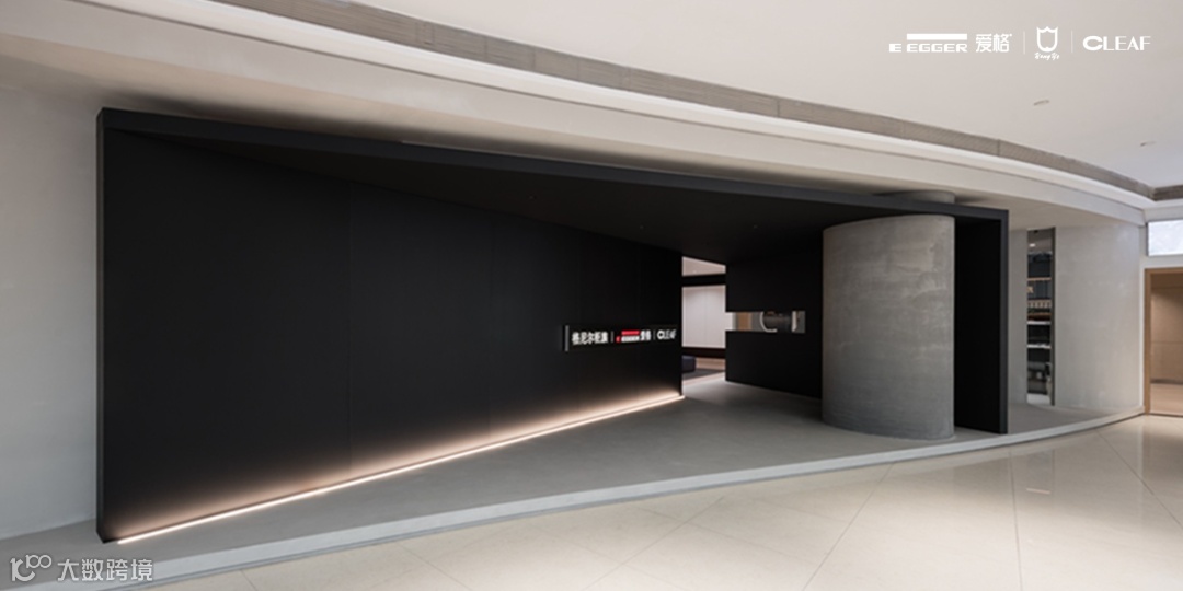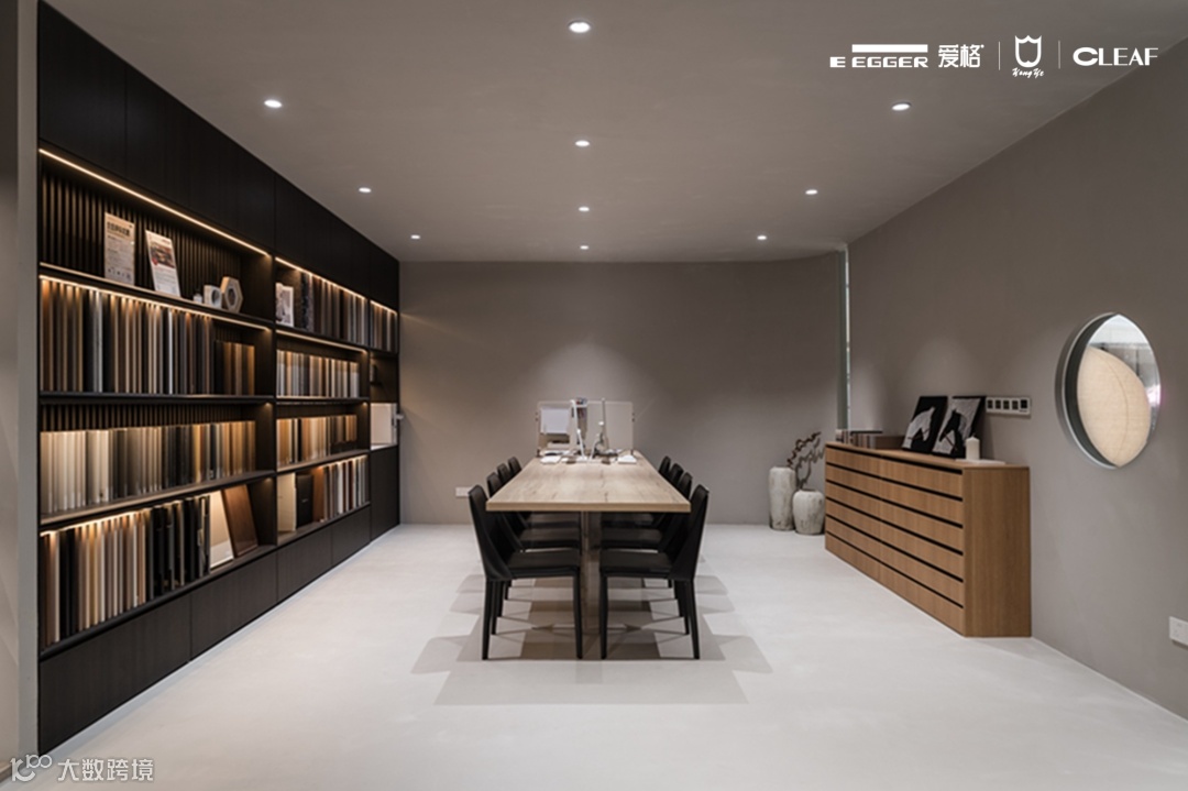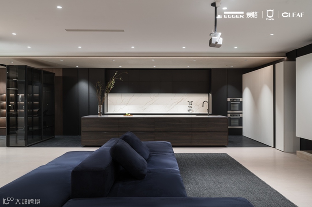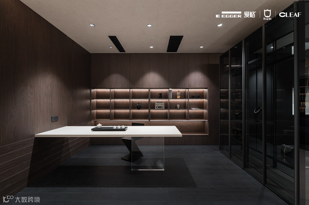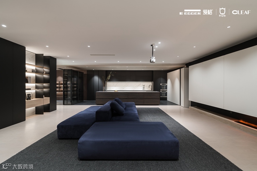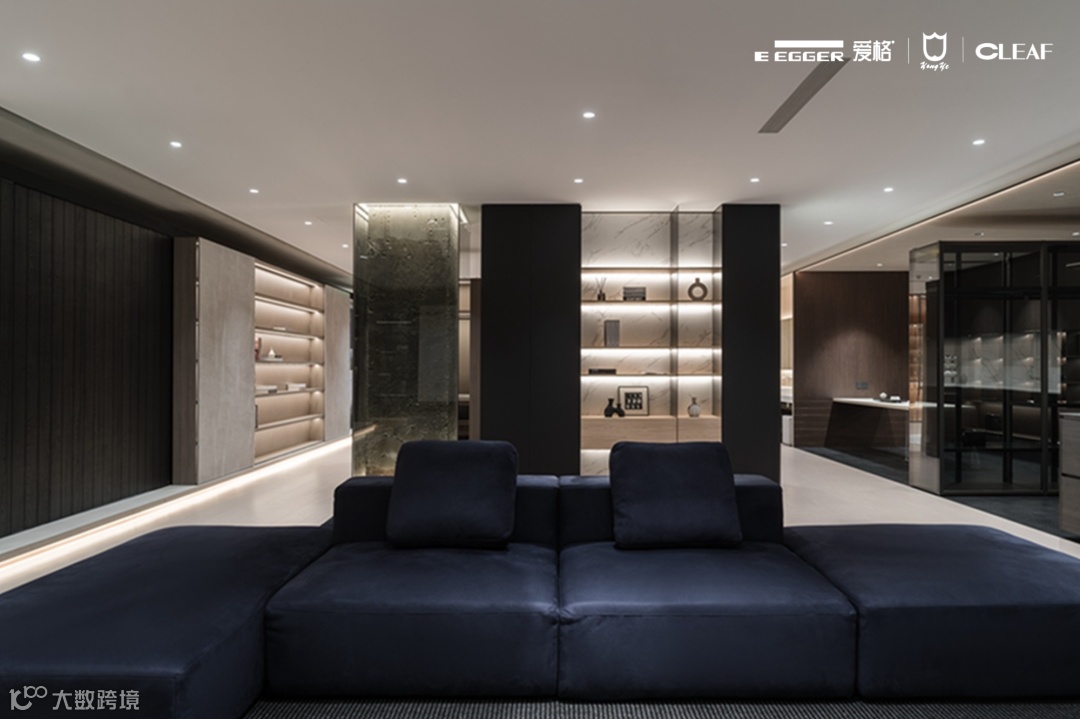 客厅展示柜选用爱格U999 TM9极致哑光面板,
