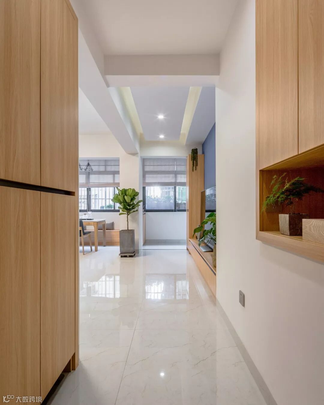 这是一套面积不大的现代北欧风格三居,全屋爱格板定制,包括玄关柜、电视柜、飘窗卡座、主卧衣柜、榻榻米、书柜还有卫浴柜,暖色调的花色,营造了一种自然温馨的家居氛围。