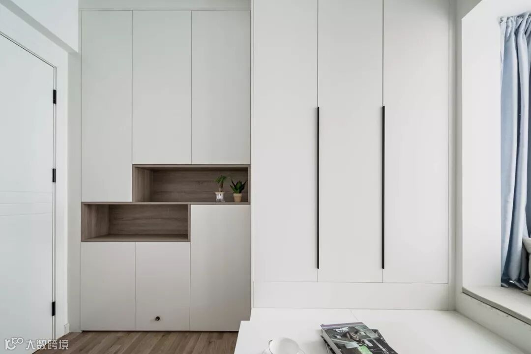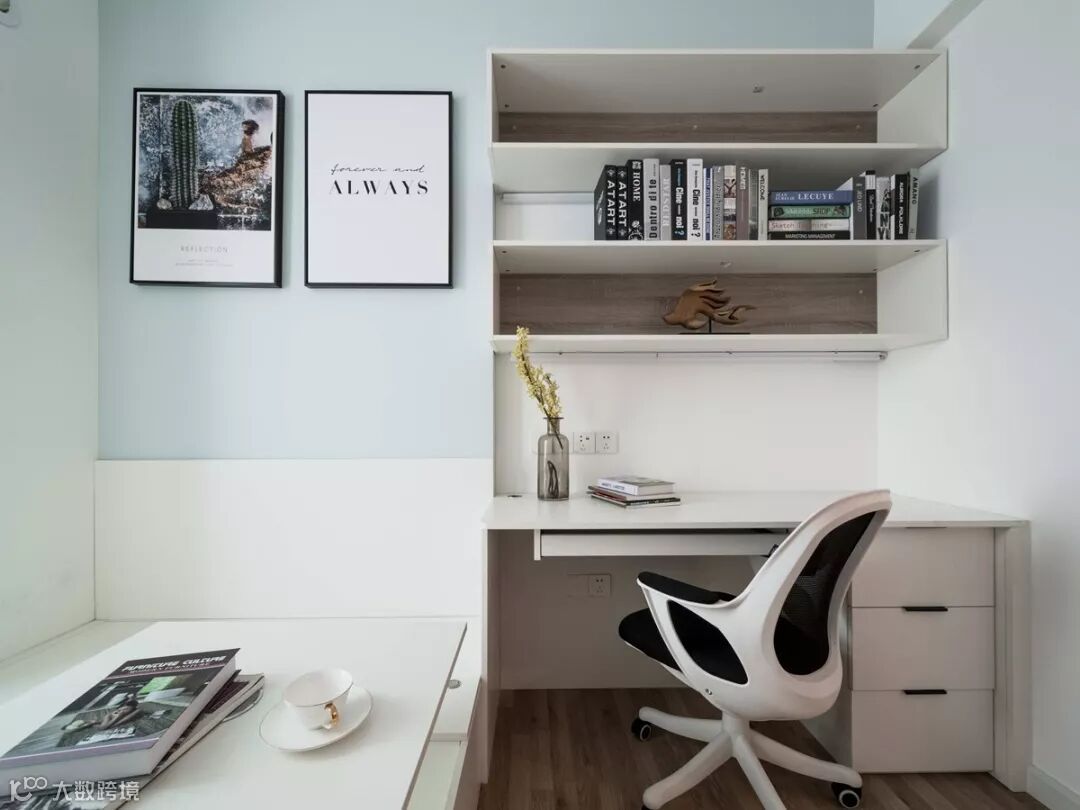 书房的书桌、书柜,榻榻米以及床尾的衣柜,都是爱格基本白色,大面积的使用让小空间看上去更宽敞明亮。