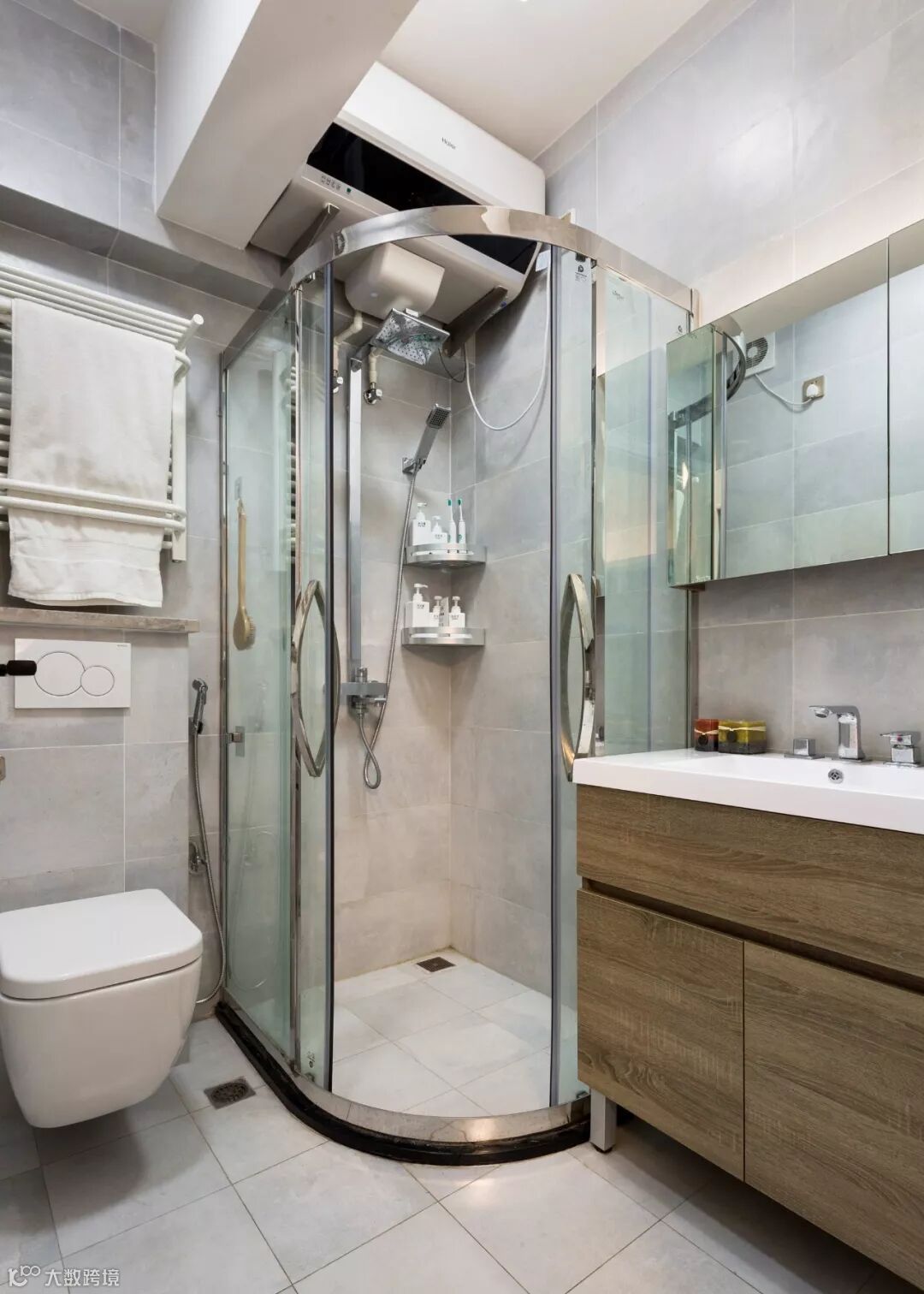 卫浴柜使用了爱格H1146 ST10灰色巴多利诺橡木,搭配白色台盆,简洁自然。爱格板具有很好的防潮性能,适用于卫浴空间。