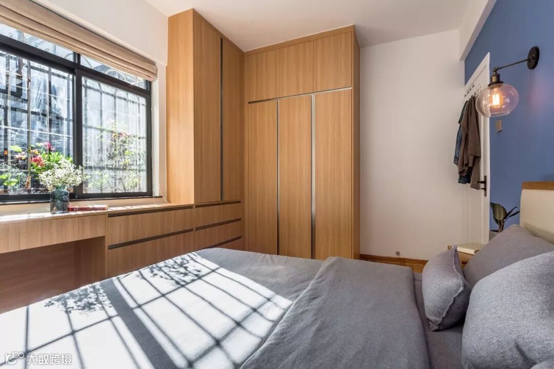 主卧室床尾沿着承重柱做了一整排的橱柜,在保证舒适的过道的前提下,梳妆台和叠衣柜的需求一次性满足,六个大抽屉让收纳更有序,一侧的大衣柜则用来挂当季的衣物。