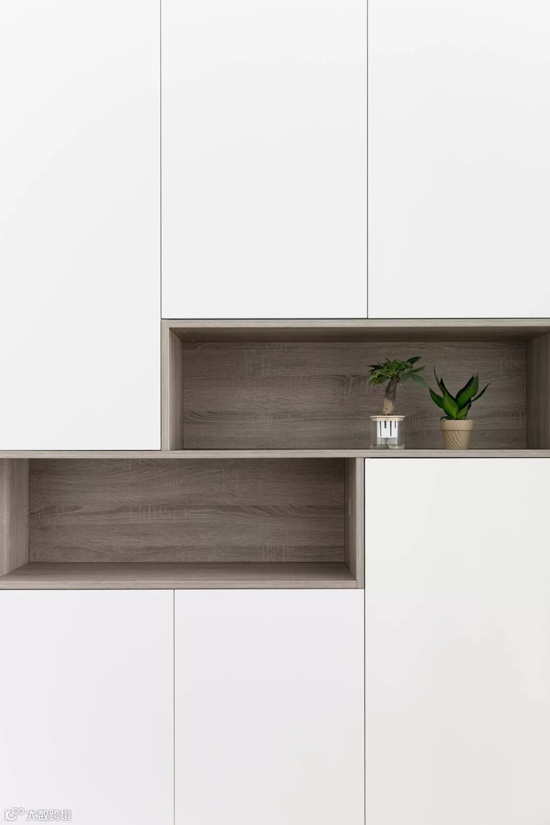 玄关嵌入式鞋柜,使用了爱格W980基本白,中间留空层,使用爱格H1146 ST10灰色巴多利诺橡木,营造了一个简约自然的玄关。