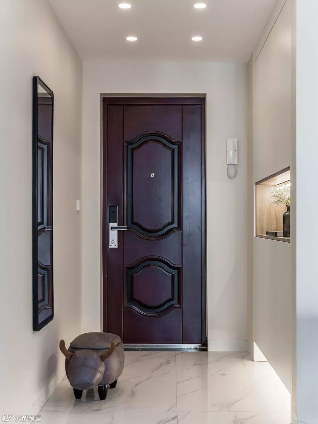 玄关两侧都打造成了收纳柜,非常实用。使用暖木纹花色H3368 ST9自然兰卡斯特橡木,一进门就能感受到家的温馨。