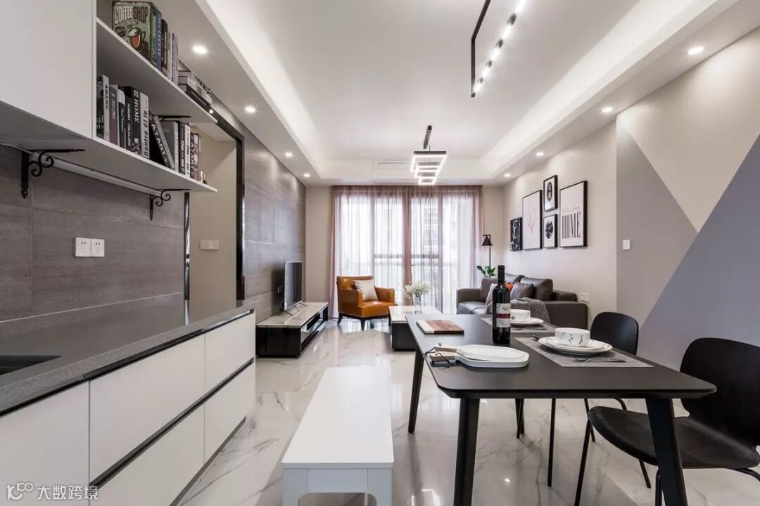 餐边柜也是使用爱格基本白色花色,搭配灰色大理石台面,黑色隐形拉手,简约时尚。