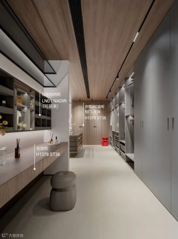 另一侧衣柜柜门柜体与顶面花色一致,视觉上向上延伸,让自然与优雅在这个空间中野蛮生长。梳妆区的抽屉也使用了H1379 ST36棕色奥尔良橡木花色,相比大面积的运用,局部的应用,则多了些许精致感。开放式的化妆品收纳格,使用的则是可丽芙LN01 NADIR纳点纹,这款花色外观简洁,却有着丰富的细节,彰显了轻奢质感。