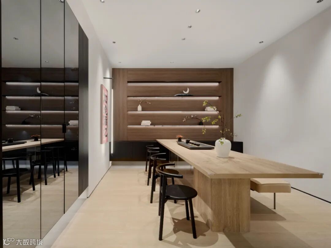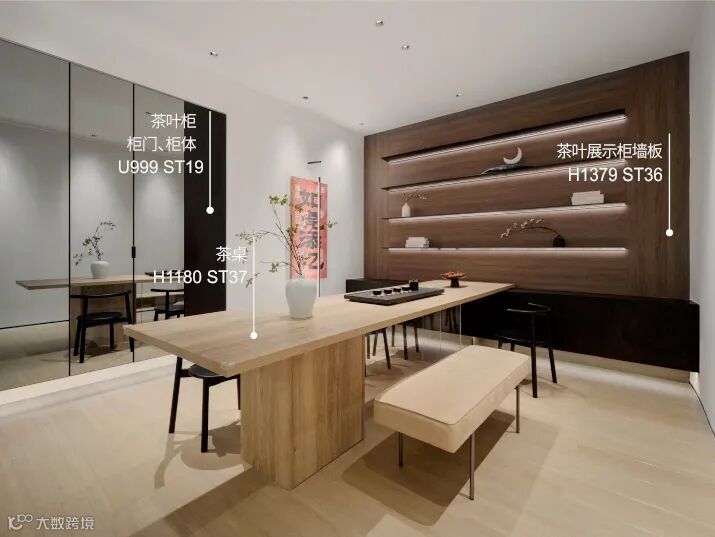 长桌是使用爱格H1180 ST37自然哈利法克斯橡木花色台面板打造,这款花色有着引人注目裂纹和结疤,带有一股大自然的原始气息,非常适合用于此场景。茶叶展示柜墙板仍采用贯穿整个展厅的H1379 ST36棕色奥尔良橡木花色,很好的渲染出了静谧而优雅空间感。