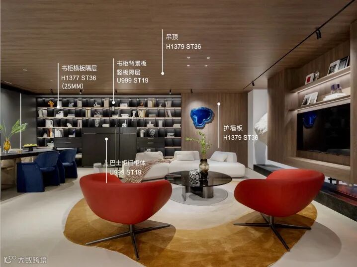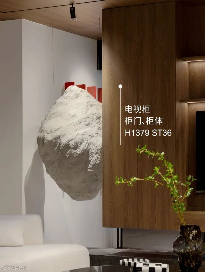 爱格H1379 ST36棕色奥尔良橡木花色从背景墙一直延伸到顶面,这款同步木纹的大面积运用,成为整个空间气质的“拿捏者”,自然、沉稳、大气、优雅、高端、轻奢......是这个空间给人的第一直觉。
