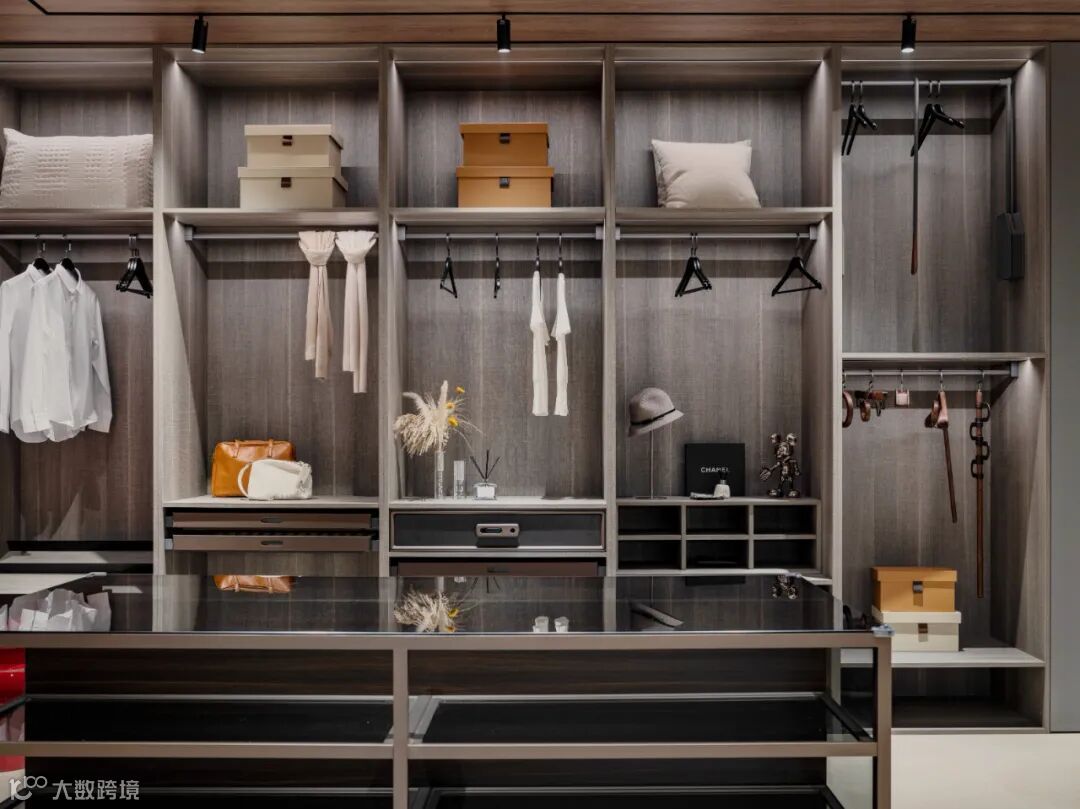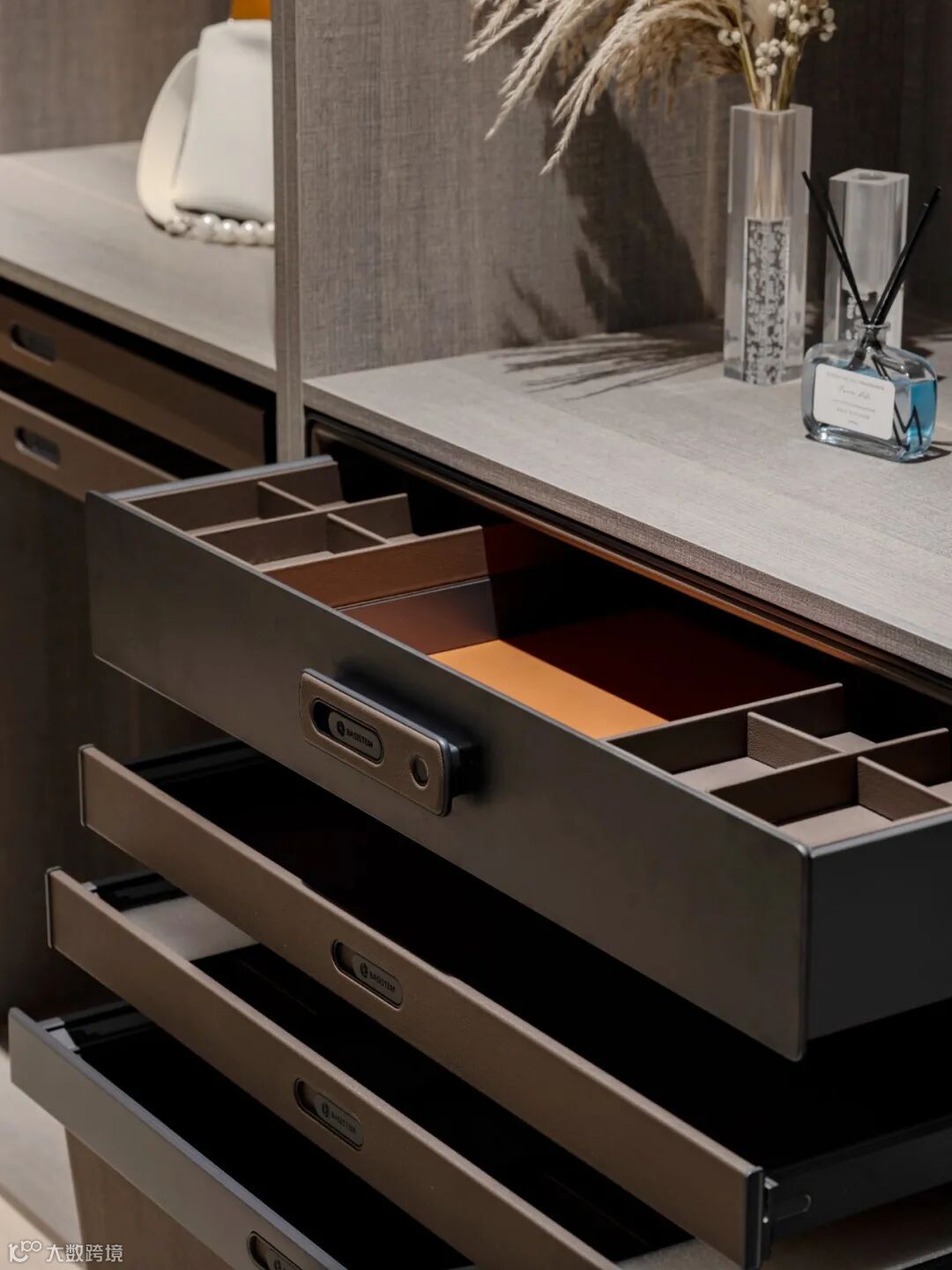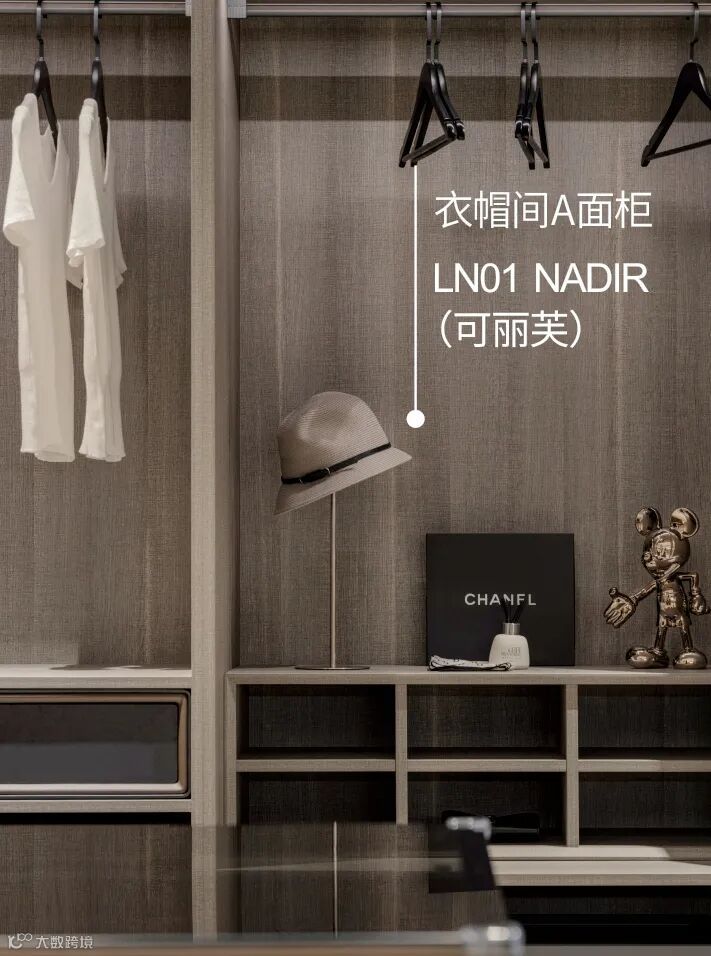 衣帽间开放柜柜体使用的是可丽芙LN01 NADIR纳点纹,从细节图可以看到表面点状图案的⼏何排列,线条柱状交错分布,可以给人带来视觉与触觉的非凡体验。
