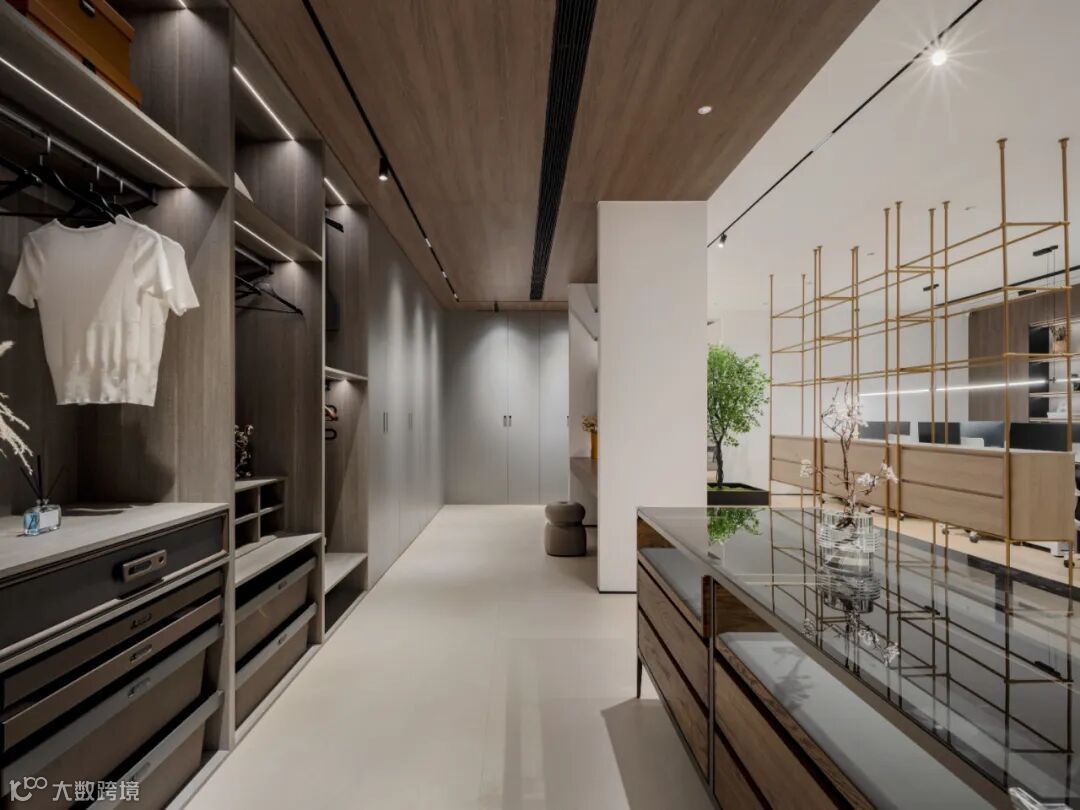 办公区与衣橱空间通过中间的隔断柜+镂空展示架进行分隔,隔断柜使用的是爱格H1377 ST36 沙棕色奥尔良橡木花色,与黄铜铁艺框架的结合,自然优雅又精美别致。
