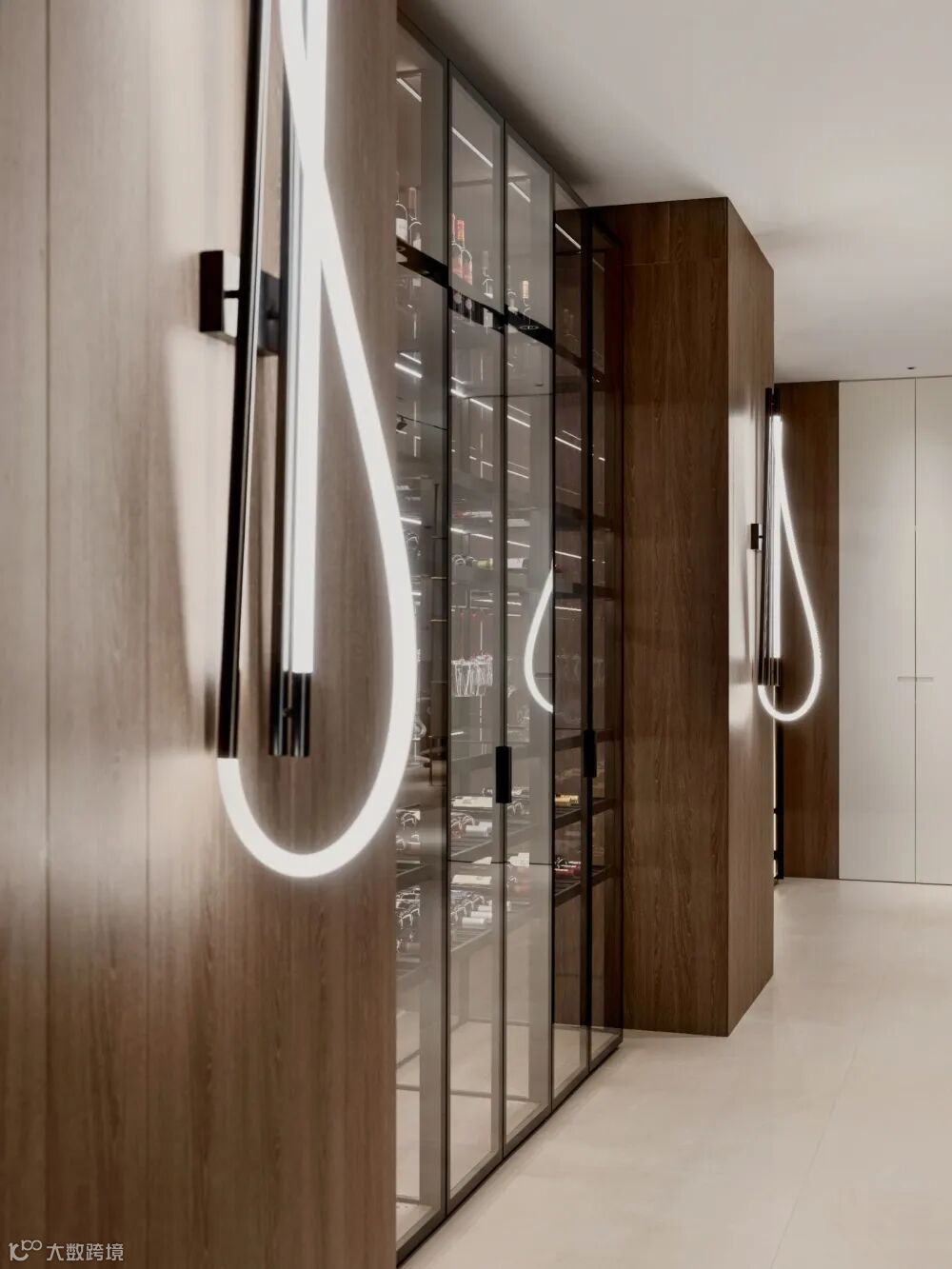 酒柜是玻璃工艺打造,两侧选择H1379 ST36棕色奥尔良橡木花色饰面板做护墙板,转角还使用了海棠角工艺制作。好的落地呈现,不仅要有好的设计,更离不开好的工艺。