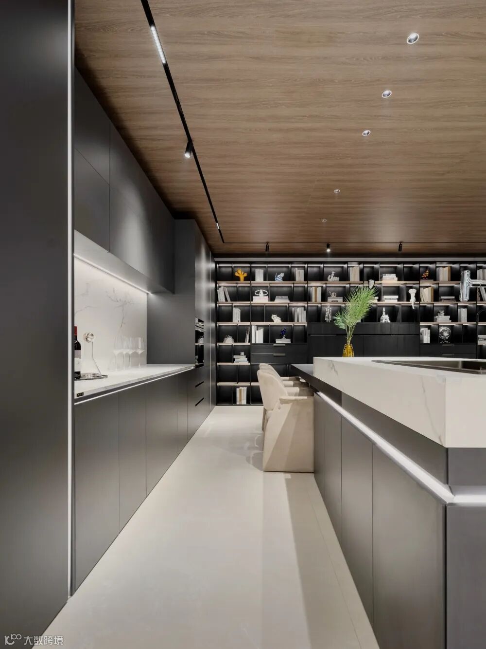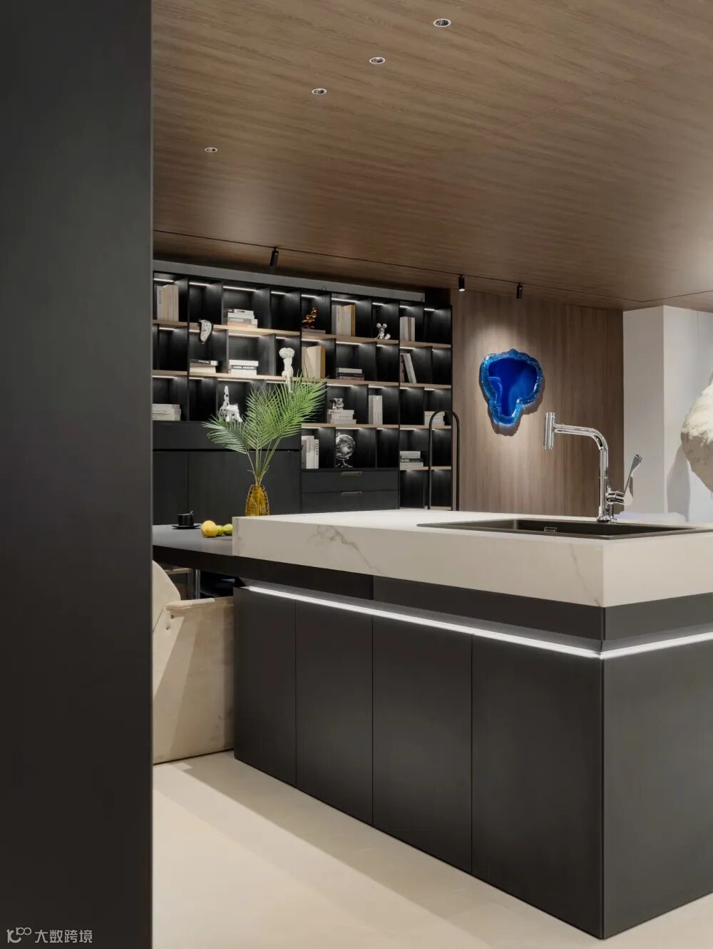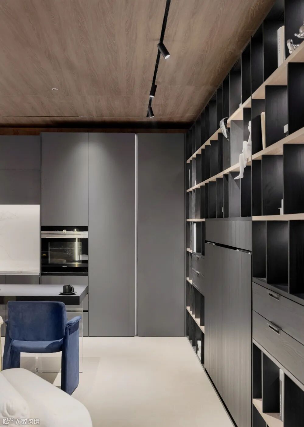 贯穿于会客区与餐厨空间的开放式书柜,背板、竖隔板、巴士柜柜门柜体、抽屉都使用了爱格U999 ST19黑色(精致深刻木纹),当黑色遇上精致深刻木纹,呈现的效果是自然、别致且优雅的。书柜横隔板则选择了爱格一款比较经典的橡木花色——H1377 ST36 沙棕色奥尔良橡木,内置灯带,中和了黑色的冷硬,让空间静谧而有温度。