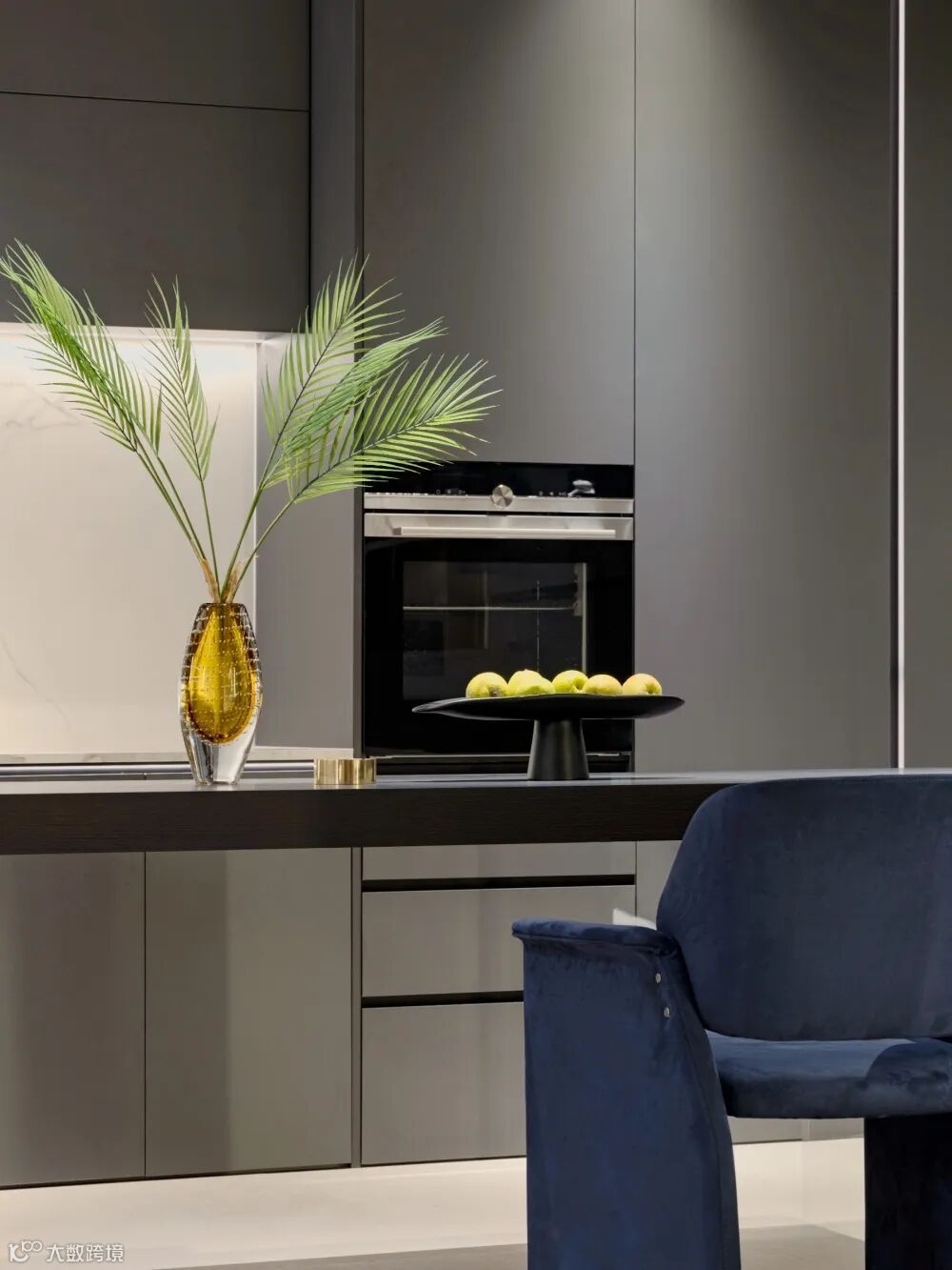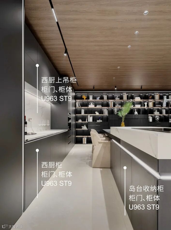 西厨橱柜、岛台收纳柜的柜门柜体都选择使用爱格U963 ST9钻石灰打造,这款花色属于黑色系的冷灰色,比纯黑色浅一些,因而作为对比色时,令对比更为柔和。